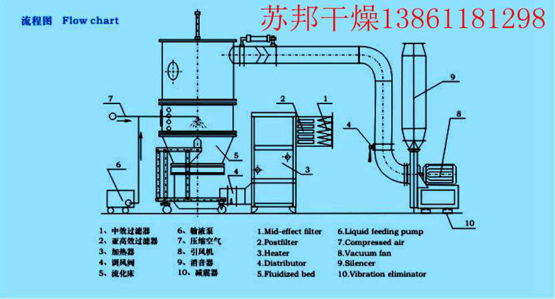 物料粉末粒子,在原料容器(流化床)中呈沸腾流化状态,受到经过净化后的加热空气预热和混合,将粘合剂溶液雾化喷入,使若干粒子聚集成含有粘合剂的团粒,由于热空气对物料的不断干燥,使团粒中水份蒸发,粘合剂凝固,此过程不断重复进行,形成理想的、均匀的多微孔球状颗粒。