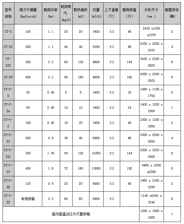 本产品经过几次升级换代,达到了国内外^。它是利用蒸汽或电为热源,用轴流风机与热交换器以对流的方式加热空气。热空气流经烘盘与物料进行热传递。新鲜空气从进风口进入烘箱进行补充,再从排湿口排出,不断的补充新鲜空气与不断的排出湿热空气,这样来保持烘箱内适当的相对湿度。本烘箱^大的特点是大部分热风在箱内进行循环从而增加了传热,节约了能源。使烘箱的热效率从传统烘房的3%~8%提高到目前的35%~50%左右,它是利用强制通风的作用,减少上下温差。我厂出厂的烘箱,均设有分风装置,用户可在使用前进行风叶调节,使上下温差处于^佳状态。