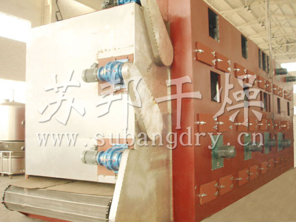 针对颜料的含湿量高、粘性大、干燥湿分的跨度大、物料细度小、比重轻等特点,专用颜料带式干燥机主要解决了水分含量高的颜料连续操作的要求,能使湿物料在带式干燥机中从进料到出料一次连续的干燥完成。采用成型挤条机解决了虑饼湿物料的制粒问题,可以把虑饼挤条成型后均匀的铺设在网带上,增加透气性以便于颜料的干燥。采用二段尾气回流的方式,解决了尾气排放中微粉的除尘问题,并且能有效的利用了能源,降低了能耗。采用一段尾气洗涤的方式,减少排放口,降低了消耗,提高了物料收率;采用尾气水汽的方法并能保证尾气达标排放。